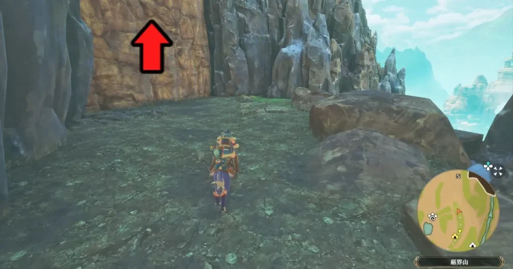 近くにイビルジョーがいる壁を登ります。もし、イビルジョーに接触してバトルになっても逃げることができますので問題ありません。