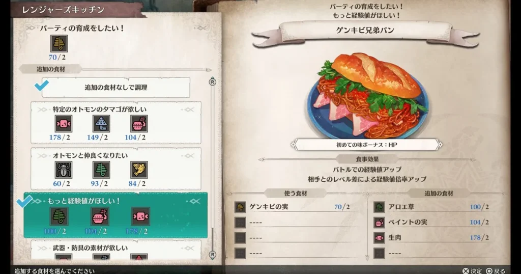経験値アップができる料理ゲンキビ兄弟パンを食べておくのがオススメです。